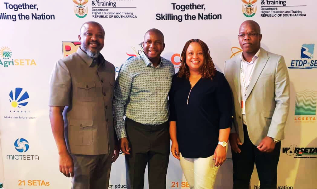 At the INSETA AGM on November 29, 2024, from left to right: Mr. Zamo Khuzwayo; SACGRA Intern Ms. Hlubi Eland; Ms. Gugu Mkhize, CEO of INSETA; SACGRA Intern Ms. Tholakele Makena; Mr. Sam Zungu, Deputy Director-General of TVET at the DHET; Dr. Innocent Sirovha, CEO of AGRISETA.